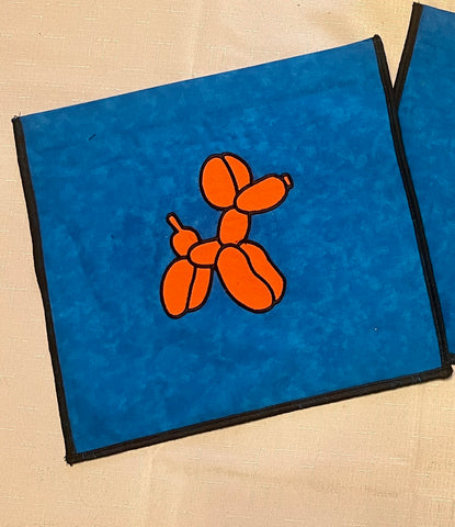 Sherry Grant has done it again. This new Pack Flat Play Big change bag is perfect for the balloon worker. The balloon dog is beautifully applique embroidery. Bag is approximately 11.5-inch X 10.5-inch deep. Plastic strips inside the panels of the bag make it easy to switch from side to side.